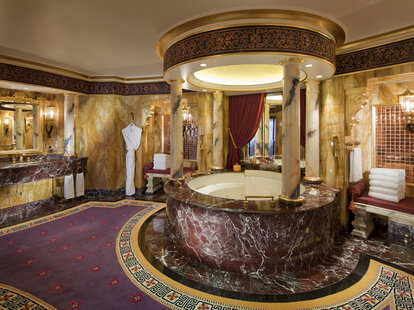 Two bedrooms means two master baths, of course, each with a full-size Jacuzzi, his and her Hermes amenities, and a super-soaker shower that'll probably ambush you as soon as you walk in the bathroom. Just don't drop your borrowed 24-karat gold iPad when you get drenched. The bathroom is decked in only the rarest marble -- the same type used by sculptor Michelangelo -- and yes, that's gold leaf detail. Also, if your pals happen to swing by, they need not soil your master bath; there are two guest restrooms "discreetly" located elsewhere in the suite.